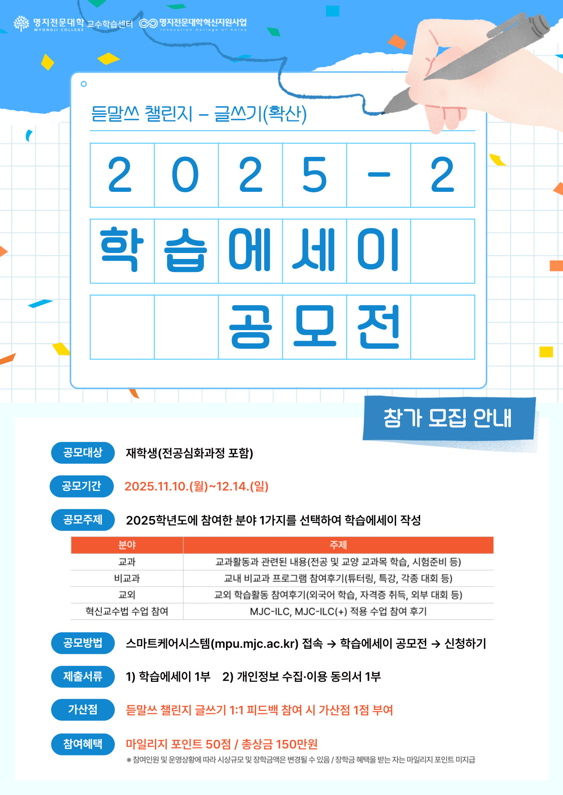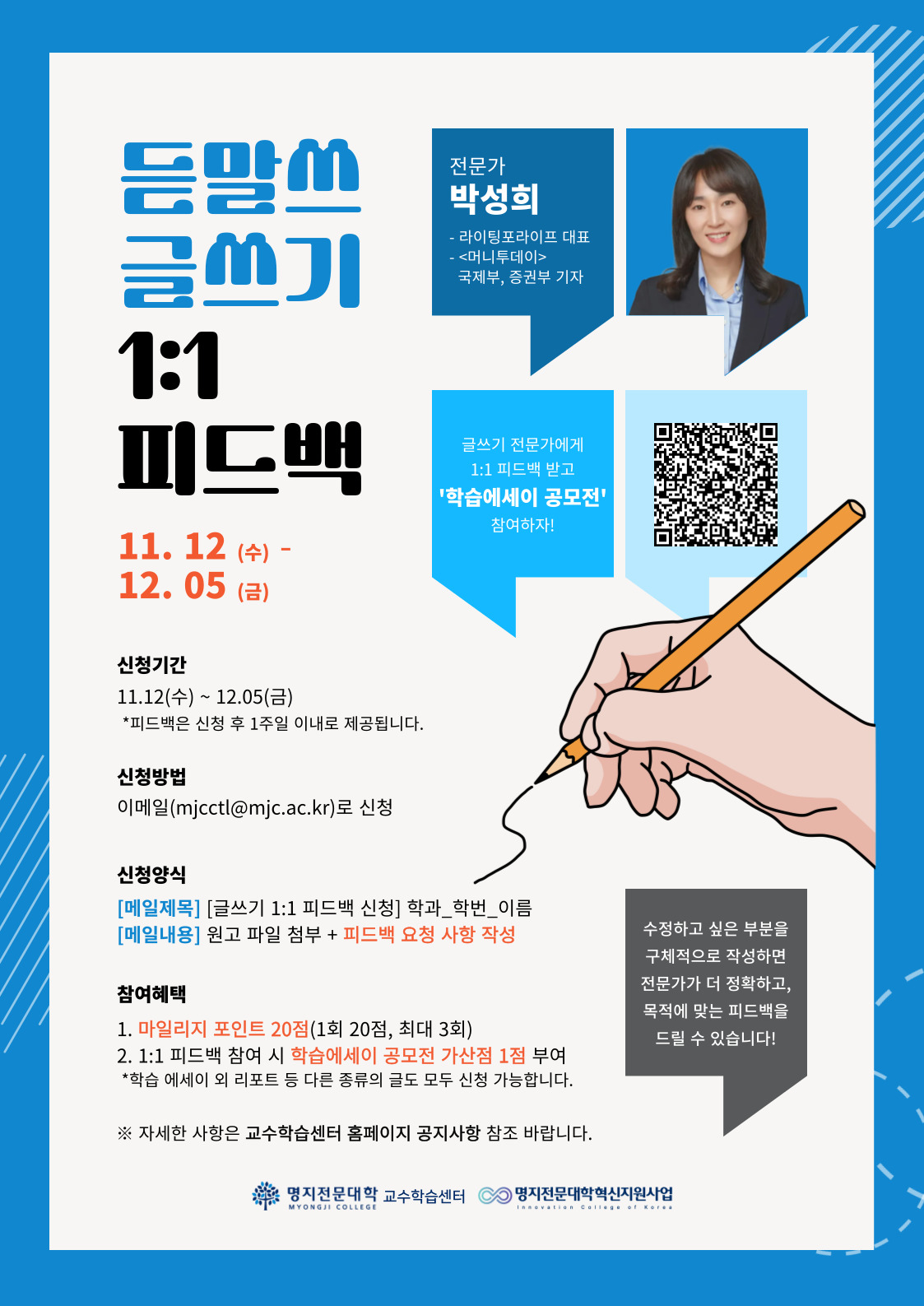 2025학년도 2학기 듣말쓰 챌린지 [글쓰기 1:1 피드백]을 실시합니다.