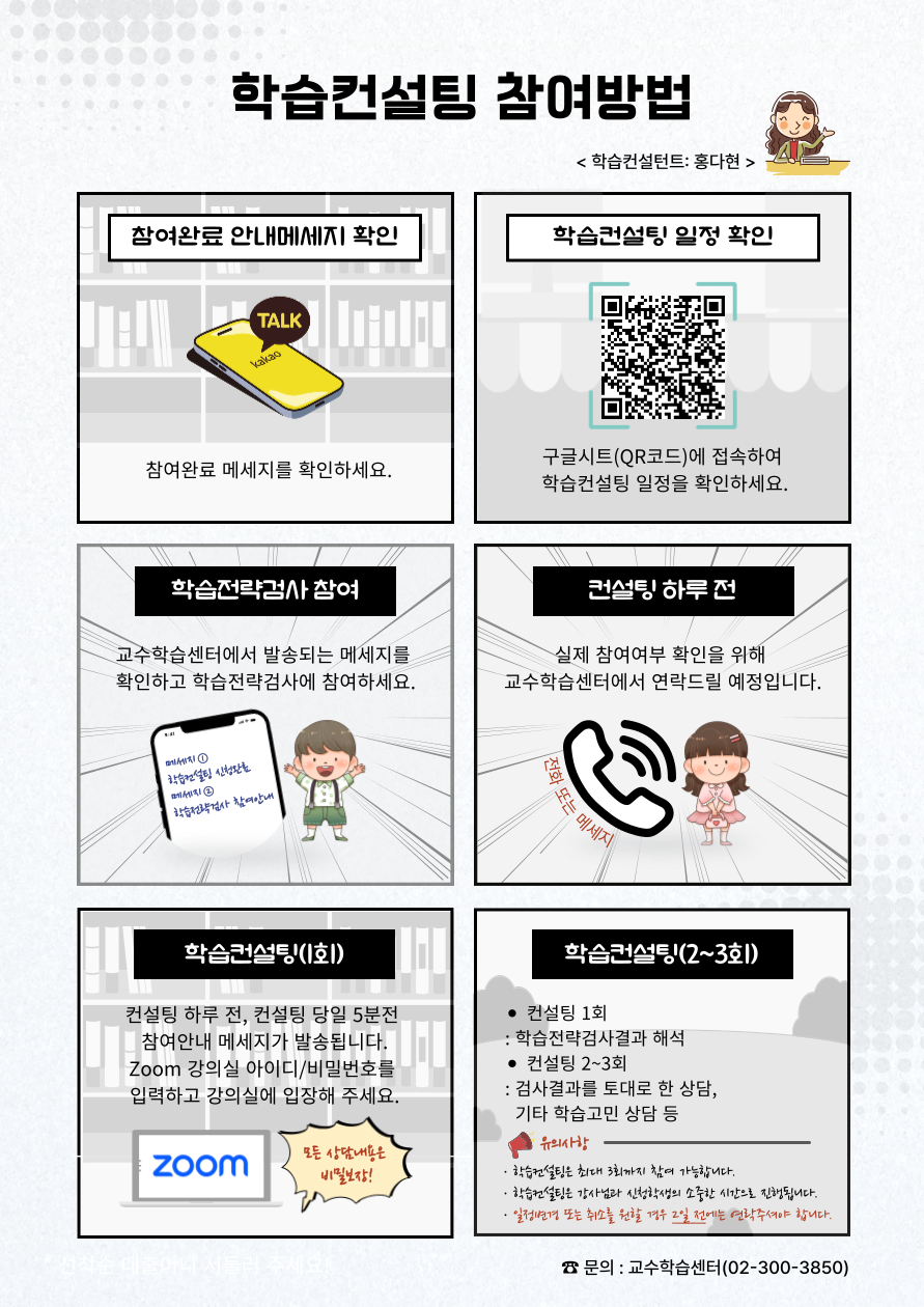- 학습컨설팅 참여가 어려워진 경우, 최소 2일 전 교수학습센터로 연락 바랍니다.(카톡채널/02-300-3850/mjcctl@mjc.ac.kr)