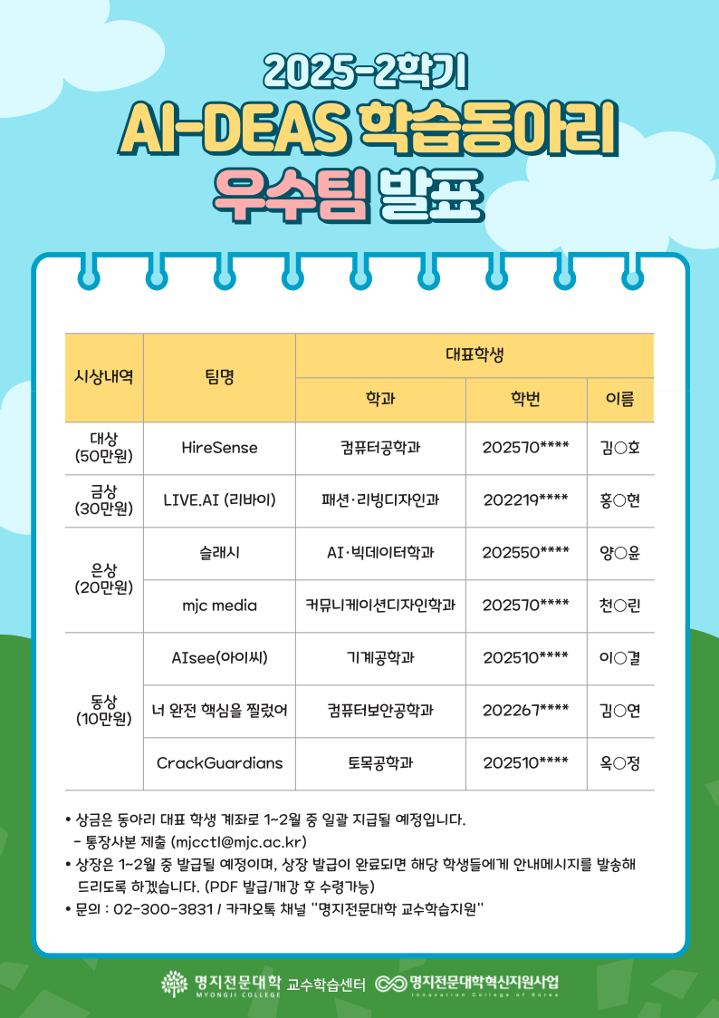 - 우수팀 상금은 동아리 대표 학생 계좌로 일괄지급됩니다.